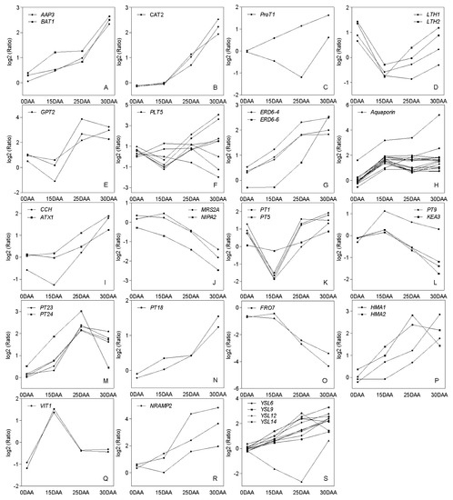 Expression trends of differentially expressed transporter genes. (A–D) Amino acid transporter genes. (E–G) Carbohydrate transporter genes. (H) Aquaporin transporter genes. (I) Cu transporter genes. (J) Mg transporter genes. (K–N) K transporter genes. (O–S) Fe and Zn transporter genes.