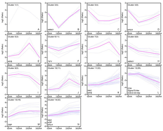 Cluster analysis of differentially expressed transcription factor genes. (A–N) The expression pattern of transcription factors of different families in the 0–15 DAA, 15–25 DAA, and 25–30 DAA period. Different colorful lines show the overall trend of genes expression in three periods. TF families are noted in the cluster where most of their members belong. The figure in parentheses indicates the gene number in the group.