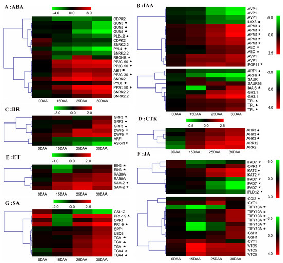 Cluster analysis of phytohormone-related DEGs. (A) ABA. (B) IAA. (C) BR. (D) CTK. (E) ET. (F) JA. (G) SA. “●”: Phytohormone receptor, “▲”: Positive regulator, “◆”: Negative regulator, “■”: Influx transporter, “★”: Efflux transporter, and “▼”: Synthesis gene.