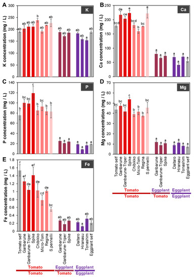 The concentrations of macroelements in the xylem exudate of various grafting combinations. The concentrations of K (A), Ca (B), P (C), Mg (D), and Fe (E) in the xylem exudate of various grafting combinations. Gray, red, red–pink, pink, red–purple, and purple indicate self-grafted plants, tomato grafted onto various rootstocks of tomato cultivars, tomato grafted onto various dwarf tomato cultivars, tomato grafted onto wild tomato, eggplant grafted onto various tomato cultivars, and eggplants grafted onto various eggplant cultivars, respectively. Different letters indicate significant differences according to the Tukey-Kramer test (p ≤ 0.05). Values are the means of four replicate samples, and error bars indicate the standard error of four replicate samples.