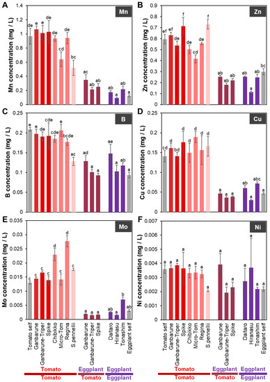 The concentrations of microelements in the xylem exudate of various grafting combinations. The concentrations of Mn (A), Zn (B), B (C), Cu (D), Mo (E), and Ni (F) in the xylem exudate of various grafting combinations. Gray, red, red–pink, pink, red–purple, and purple indicate self-grafted plants, tomato grafted onto various rootstocks of tomato cultivars, tomato grafted onto various dwarf tomato cultivars, tomato grafted onto wild tomato, eggplant grafted onto various tomato cultivars, and eggplants grafted onto various eggplant cultivars, respectively. Different letters indicate significant differences according to the Tukey-Kramer test (p ≤ 0.05). Values are the means of four replicate samples, and error bars indicate the standard error of four replicate samples.