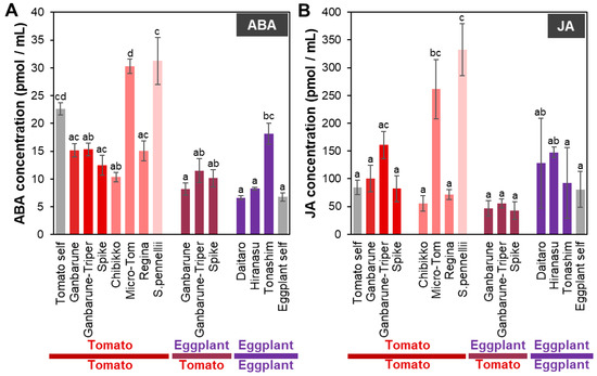 The concentrations of ABA and JA in the xylem exudates of various grafting combinations. The concentrations of ABA (A) and JA (B) in the xylem exudates of various grafting combinations. Gray, red, red–pink, pink, red–purple, and purple indicate self-grafted plants, tomato grafted onto various rootstocks of tomato cultivars, tomato grafted onto various dwarf tomato cultivars, tomato grafted onto wild tomato, eggplant grafted onto various tomato cultivars, and eggplants grafted onto various eggplant cultivars, respectively. Different letters indicate significant differences according to the Tukey-Kramer test (p ≤ 0.05). Values are the means of four replicate samples, and error bars indicate the standard error of four replicate samples.
