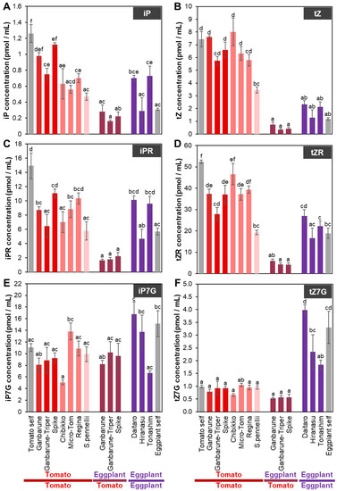 The concentration of CKs in the xylem exudates of various grafting combinations. The concentrations of N 6-(Δ 2-isopentenyl)-adenine (iP) (A), iP riboside (iPR) (B), iP-7-N-glucoside (iP7G) (C), trans-zeatin (tZ) (D), tZ riboside (tZR) (E), and tZ-7-N-glucoside (tZ7G) (F) in the xylem exudates of various grafting combinations. Gray, red, red–pink, pink, red–purple, and purple indicate self-grafted plants, tomato grafted onto various rootstocks of tomato cultivars, tomato grafted onto various dwarf tomato cultivars, tomato grafted onto wild tomato, eggplant grafted onto various tomato cultivars, and eggplants grafted onto various eggplant cultivars, respectively. Different letters indicate significant differences according to the Tukey-Kramer test (p ≤ 0.05). Values are the means of four replicate samples, and error bars indicate the standard error of the four replicate samples.