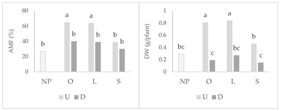 Graphs of interactions between previous plant type and soil disturbance in wheat root colonization by arbuscular mycorrhizal fungi (AMF) and shoot dry weight (DW). NP: wheat that grew with no previous plants; O: wheat that grew after O. compressus; L: wheat that grew after L. rigidum; S: wheat that grew after S. gallica; U: soil undisturbed and D: soil disturbed. Values sharing different letters indicate significant differences between treatments at the 5% level (Tukey’s t-test).