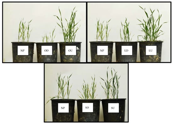 Comparison of wheat growth 21 days after planting. OD: after O. compressus under disturbed treatment; OU: after O. compressus under undisturbed treatment; LD: after L. rigidum under disturbed treatment; LU: after L. rigidum under undisturbed treatment.