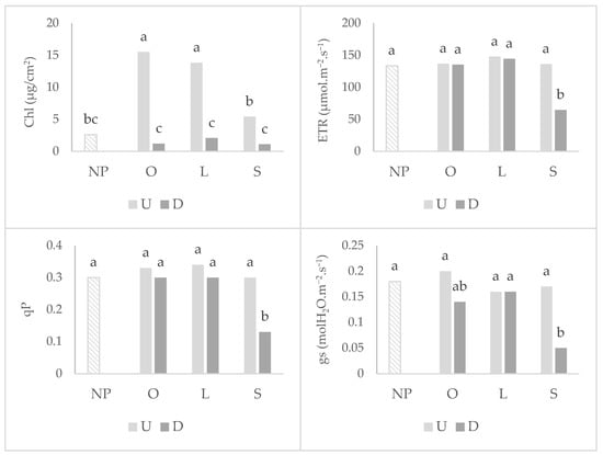 Graphs of interactions between previous plant type and soil disturbance in wheat photosynthetic parameters: chlorophyll content (Chl), electron transfer rate (ETR), photochemical quenching (qP) and stomatal conductance to water vapor (gs). NP: wheat that grew with no previous plants; O: wheat that grew after O. compressus; L: wheat that grew after L. rigidum; S: wheat that grew after S. gallica; U: soil undisturbed and D: soil disturbed. Values sharing different letters indicate significant differences between treatments at the 5% level (Tukey’s t-test).
