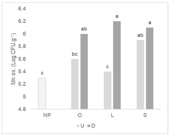 Graph of interactions between previous plant type and soil disturbance in Mn oxidizers (Mn ox.) count after wheat growth. NP: wheat that grew with no previous plants; O: wheat that grew after O. compressus; L: wheat that grew after L. rigidum; S: wheat that grew after S. gallica; U: soil undisturbed and D: soil disturbed. Values sharing different letters indicate significant differences between treatments at the 5% level (Tukey’s t-test).