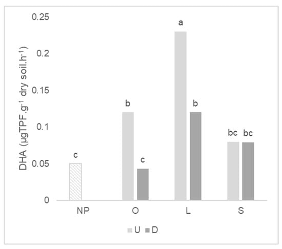 Graph of interactions between previous plant type and soil disturbance in dehydrogenase (DHA) activity after wheat growth. NP: wheat that grew with no previous plants; O: wheat that grew after O. compressus; L: wheat that grew after L. rigidum; S: wheat that grew after S. gallica; U: soil undisturbed and D: soil disturbed. Values sharing different letters indicate significant differences between treatments at the 5% level (Tukey’s t-test).