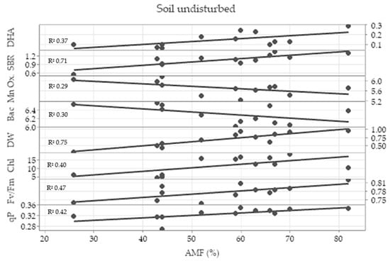 In the undisturbed treatment, the Pearson correlation test showed a strong correlation coefficient of root colonization by arbuscular mycorrhizal fungi (AMF) with dehydrogenase activity (0.636), soil basal respiration (0.776), total bacteria (−0.608), Mn oxidizers (−0.517), dry weight (0,853), chlorophyl content (0.594), maximum quantum efficiency of PSII (0.599) and photochemical quenching (0.754). The linear regression analysis showed a great coefficient of linear regression between root colonization by AMF and shoot dry weight (DW) and soil basal respiration (SBR), and it showed a moderate coefficient of linear regression between root colonization by AMF and photosynthetic parameters (Figure 6).