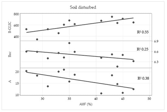 In the disturbed treatment, a correlation between root colonization by AMF and β-glucosidase activity (0.783), total bacteria (−0.559) and photosynthetic rate (−0.580) was found according to the Pearson correlation test. In the linear regression (Figure 7), a moderate coefficient was found between root colonization by AMF and β-glucosidase (B-GLIC) activity and weak coefficient was found in relation with total bacteria (Bac) and photosynthetic rate (A).