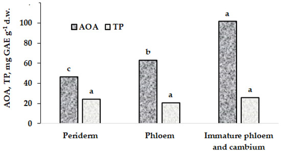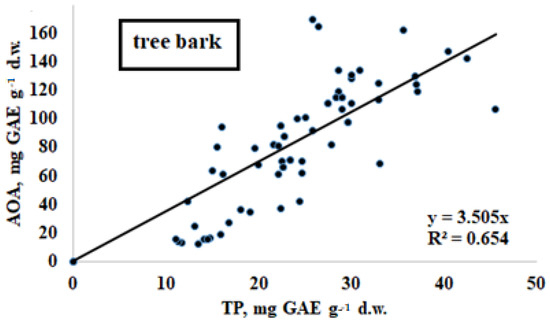 On the other hand, attention should be paid to the fact that even the lowest bark AOA values are higher or not different from the correspondent parameters recorded in popular vegetables such as parsley (AOA 44–68 mg GAE g−1 d.w.) [17], tomatoes (18–23 mg GAE g−1 d.w.) [18], and onion bulbs (34–58 mg GAE g−1 d.w.) [19], which proves the expedience of tree bark utilization as a significant source of natural antioxidants. The results presented below are mean values of antioxidant status for bark overall, including the cambium, phloem, and periderm due to difficulties separating these components from rather small tree branches.