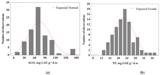 AOA and TP histograms of all species tested (Figure 3) show the normal distributions of these parameters with the median values reaching 72 and 23 mg GAE g−1 d.w., respectively.
