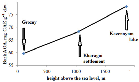 Bark sampling in the Chechen republic, situated in the northern part of Caucasus, gave an excellent opportunity to evaluate the altitude effect on bark AOA. In fact, differently from the other regions investigated, which were not so much affected by the altitude of bark sampling, the insignificance of the AOA/TP correlation in the Chechen Republic is supposedly connected to the altitude of bark sampling. Indeed, the mean bark AOA values for the plants of Grozny (103 m above sea level), Kharagol settlement (1008 m above sea level), and in the vicinity of the mountainous Kezenoyam lake (1800 m above sea level) differ significantly between each other, demonstrating that AOA increases with the altitude’s increase (Figure 5).