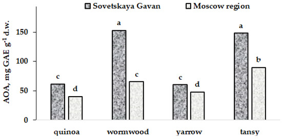 AOA of quinoa (Atriplex), yarrow (Achillea millefolium), tansy (Tanacetum vulgare), and wormwood (Artemisia vulgaris). Values with the same letters do not differ statistically according to Duncan test at p < 0.05.