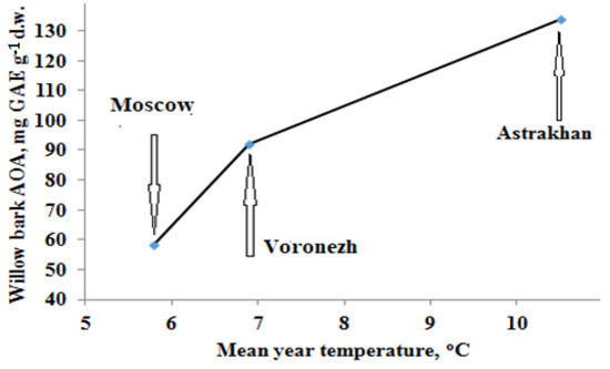 Separate AOA data of bark samples gathered in regions with different temperature regimes support the beneficial effect of environmental stress (Figure 6). Indeed, willow bark showed the highest antioxidant activity in Astrakhan compared to the Moscow and Voronezh regions characterized by much lower mean annual temperatures (Figure 7).