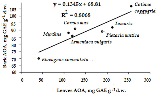 Leaves–bark AOA correlation for separate Karadag trees. (r = 0.898; p < 0.01).