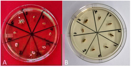 Shoots were isolated from six-week-old cultures and used for the isolation of bacterial contaminants. Initially, apparent bacterial contamination was detected visually, collected, and aseptically streaked in Petri dishes (100 mm × 15 mm) containing bacteriological growth medium 523, a general media for the growth of bacteria composed of 8 g L−1 casein hydrolysate (Sigma-Aldrich, St. Louis, MO, USA), 10 g L−1 sucrose, 4 g L−1 yeast extract, 2 g L−1 monopotassium phosphate (KH2PO4), 0.15 g L−1 magnesium sulfate (MgSO4 7H2O), and 6 g L−1 Gelrite™ at pH 6.9 [97]. Plates were incubated at room temperature. After 48 h of incubation, the developed colonies were purified by repeating isolation. Solitary colonies of contamination were collected using swabs and subsequent immersion into a tube containing Amies medium [98]. To obtain pure culture, all samples were cultivated on esculin–gelatin medium with incubation at 37 °C for 48 h under anaerobic conditions [99]. Thereafter, isolates were identified by MALDI-TOF/MS (Bruker Daltonik GmbH, Bremen, Germany), as described by Kozhakhmetova et al. [99]. MALDI-TOF/MS scores of ≥1.7 were accepted for species assignment, and scores below 1.7 were considered unreliable [99]. Further micropropagation experiments were carried out with indexed shoots.