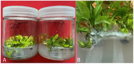 Apple (Malus spp.) in vitro cultures exhibiting microbial contamination. (A) Cultures exhibiting microbial contamination 6 weeks after subculture; (B) a closer view of cultures where bacterial colonies have formed around the base of shoots and on the surface of the medium.
