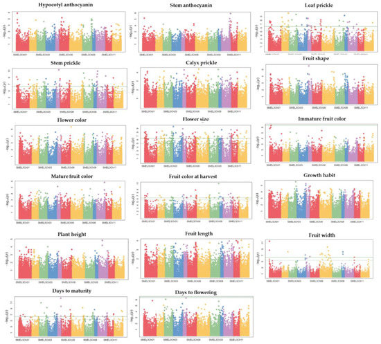 - Portis, E.; Cericola, F.; Barchi, L.; Toppino, L.; Acciarri, N.; Pulcini, L.; Sala, T.; Lanteri, S.; Rotino, G.L. Association Mapping for Fruit, Plant and Leaf Morphology Traits in Eggplant. PLoS ONE 2015, 10, e0135200. [Google Scholar] [CrossRef] [PubMed]