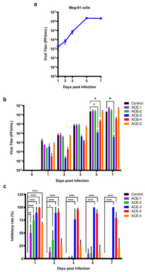 Meg-01 cells were treated with different A. cinnamomea extracts after DENV infection, and the viral titers of DENV were evaluated using a plaque assay (Figure 2). The concentrations of ACE-1–ACE-5 were used in viral titer, which are 3.84, 5.67, 91.68, 176.51, 5.68 μg/mL, respectively. The replication curve for DENV in Meg-01 cells was calculated. The viral titer peak was observed on day 5 post-infection and remained steady until day 7 (Figure 2a). The antiviral effects of A. cinnamomea extracts on DENV were determined by performing a plaque assay with the supernatants collected on different days post-infection. From the results, it was observed that the viral titers of DENV decreased in both ACE-3 and ACE-4 treatments during DENV infection as of day 2. Moreover, a significant reduction in DENV resulting from ACE-3 and ACE-4 treatments was also observed at days 5 and 7 post-infection (Figure 2b). Although there was a visible decrease in the viral titer of DENV at 24 h after DENV infection in ACE-1, ACE-2, and ACE-3 treatments, the difference was not statistically significant.