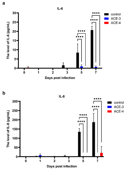 ACE-3 and ACE-4 suppressed the expression of the IL-6 and IL-8 after DENV infection. The levels of (a) IL-6 and (b) IL-8, in Meg-01 cells treated with the A. cinnamomea extracts after DENV infection. All the values represent as mean ± SEM of three experiments. p values were calculated using two-way ANOVA, p < 0.0001 **** compared to the control.