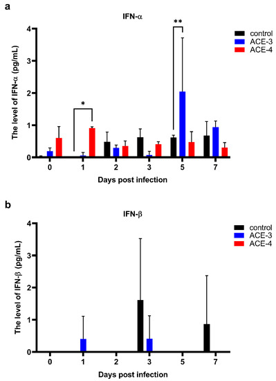 ACE-3 and ACE-4 may inhibit DENV replication by enhancing the secretion of IFN-α. The levels of antiviral cytokines, (a) IFN-α and (b) IFN-β, in Meg-01 cells treated with A. cinnamomea extracts after DENV infection. All the values represent as mean ± SEM of three experiments. p values were calculated using two-way ANOVA, statistically significant difference * p < 0.05, ** p < 0.01 compared to the control.
