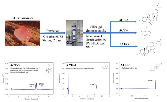 ACE-3, ACE-4, and ACE-5 isolation: The dried and pulverized A. cinnamomea fruiting body samples were extracted thrice with 95% ethanol at a ratio of 1:10 (w/v) for 2 days at room temperature under constant stirring at 125 rpm. After two days, the ethanol solution was filtered and concentrated to dryness in vacuo. The crude extract was suspended in deionized water and successively partitioned with ethyl acetate (EtOAc). The concentrated EtOAc layer was chromatographed on a silica gel column by elution with an n-hexane/EtOAc gradient with increasing polarity, yielding five fractions. The fractions were then analyzed using high-performance liquid chromatography to obtain ACE-3, ACE-4 and ACE-5, respectively. The structures of the compounds (ACE-3, ACE-4, and ACE-5) were determined by 1H and 13C nuclear magnetic resonance spectroscopy and by comparison of the spectral data with published values [60,61,62,63]. A summary of the current protocol is shown in Figure 5.