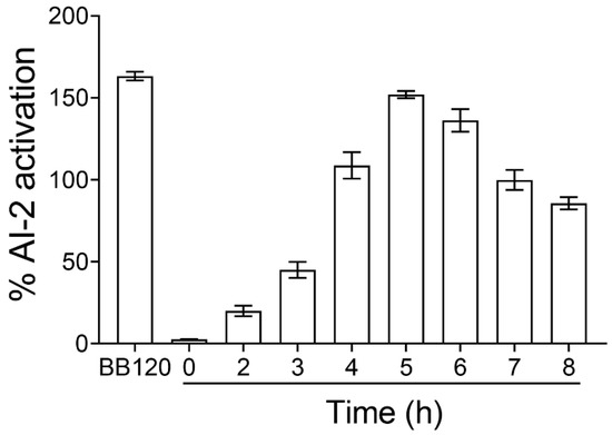 Time course of the AI-2 signaling activity in E. coli MG1655. E. coli was grown in LB medium supplemented with 0.5% glucose at 37 °C. At the indicated times, cell-free supernatants (CFSs) were prepared and assayed for AI-2 activity. The AI-2 signaling activity is presented as the percent activation compared to the non-inoculated negative control with CFS. A CFS obtained from an overnight culture of V. harveyi BB120 (AI-1+, AI-2+) was used as a positive control.