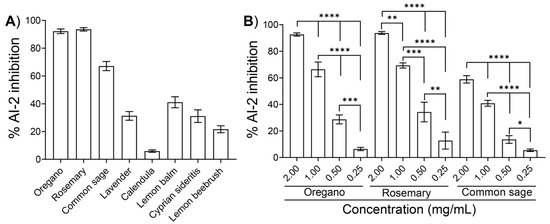 Effects of ethanolic extracts on the AI-2 activity of E. coli MG1655. Cell-free supernatants were collected from an E. coli culture in LB medium supplemented with 0.5% glucose after 5 h of cultivation at 37 °C and assayed for AI-2 activity in the presence of (A) one of the indicated plant extracts at a final concentration of 2 mg/mL or (B) different concentration of extracts obtained from oregano, rosemary, or common sage. The AI-2 signaling activity is presented as the percent inhibition compared to that of samples containing none of the extracts (blank control). The values are the means of the results of three independent experiments. Error bars indicate standard deviations. In (B), an ANOVA followed by Tukey’s multiple-comparison test was used for statistical analysis. Statistically significant differences are indicated with asterisks: * p < 0.05, ** p < 0.01, *** < 0.001 **** p < 0.0001.