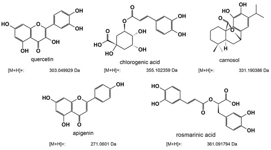 Chemical structures of the active compounds detected in the ethanolic extracts of oregano, rosemary, and common sage through LC-MS.