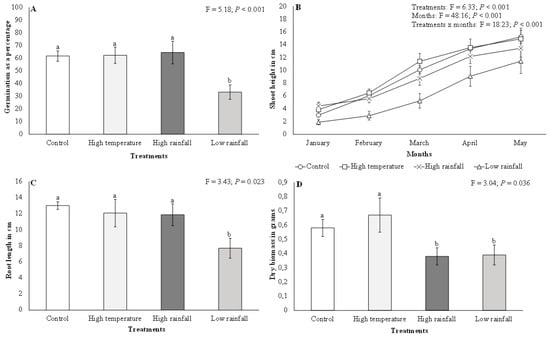 Effects of elevated temperature and high and low rainfall on Acacia mearnsii (A) germination as a percentage, (B) shoot height in cm, (C) root length in cm, and (D) dry biomass in grams. Bars are means ± SE and ANOVA results are shown. Bars with different letter superscripts are significantly different.