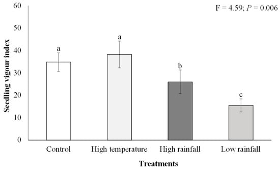 Effects of elevated temperature and high and low rainfall on Acacia mearnsii seedling vigour index II. Bars are means ± SE and one-way ANOVA results are shown. Bars with different letter superscripts are significantly different.