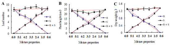 In order to compare the competitive effect between R and S biotypes, replacement series experiments were carried out in this study. As shown in Figure 3A, when R and S biotypes were grown together in different proportions, the leaf number shifted right of the 3:3 ratio, suggesting the S biotype was slightly more competitive than the R biotype. However, replacement series diagrams for plant height and dry weight had the line intersection very close to the 3:3 ratio point, indicating that the S biotype is equally competitive to the R biotype (Figure 3B,C).