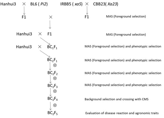 Marker-assisted backcross breeding was employed to transfer Pi2, xa5, and Xa23 genes into the genetic background of Hanhui3. Two independent crossing programs were carried out for the development of the near-isogenic line (NIL), one using Hanhui3 as the female and BL6 as the male, and the other using IRBB5 as the female and CBB23 as the male. Two true F1 plants, which were confirmed by genetically linked markers, were crossed with each other to obtain F1 plants carrying Pi2, xa5, and Xa23 genes. True F1 plants were identified by genetically linked markers and were backcrossed with Hanhui3 to produce BC1F1 seeds. The resulting BC1F1 plants were first checked for the presence of Pi2, xa5, and Xa23 genes via genetically linked markers. Then, three positive plants possessing maximum similarity to the phenotype of Hanhui3 were used to generate BC2F1 seeds. Among 61 BC2F1 plants, 9 individuals containing Pi2, xa5, and Xa23 genes and with a phenotype similar to Hanhui3 were self-crossed to produce BC2F2 seeds. In the BC2F2 population totaling 840 plants, 14 plants containing homozygous Pi2, xa5, and Xa23 genes and a phenotype similar to Hanhui3 were selected to produce BC2F3 seeds (Figure S1). From the BC2F3 family lines, eight lines containing homozygous Pi2, xa5, and Xa23 genes that had no phenotypic variation were selected to produce BC2F4 seeds.