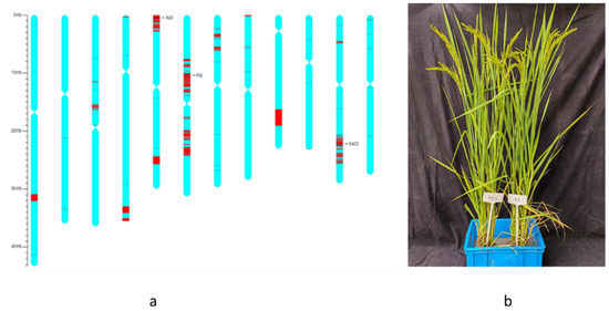 Genetic background assay and phenotype of the improved NIL. (a) The black lines indicate the positions of three target genes, xa5 on chromosome 5, Pi2 on chromosome 6, and Xa23 on chromosome 11. The red lines indicate the SNP loci with homozygous genotypes where genomic fragments of the donor parents were introgressed. The green lines indicate the SNP loci with the same genotypes as the recurrent parent Hanhui3. (b) The phenotype of the improved NIL and recurrent parent. Left is NIL. Right is recurrent parent Hanhui3.