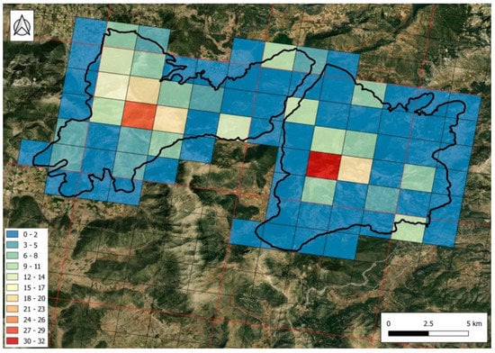 Number of Greek endemic taxa (depicted with color scale) recorded in each of the 2 × 2 km grid cells on Mts. Oligirtos and Farmakas. The study area (black line) and 10 × 10 km European Environment Agency (EEA) grid (red line) are also indicated. Grid cells covered less than 0.2% (i.e., 8000 m2) of the study area have been ignored.