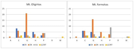 Classification of the Greek endemic taxa of Mts. Oligirtos and Farmakas in IUCN Red List categories, according to the main habitats each of the endemic plants prefers. LC/NT: Least Concerned/Near Threatened, VU: Vulnerable, EN: Endangered, CR: Critically Endangered. A: Freshwater habitats, C: Cliffs, rocks, walls, ravines, boulders, G: Temperate and submediterranean grasslands, H: High mountain vegetation, P: Xeric Mediterranean phrygana and grasslands, R: Agricultural and ruderal habitats, W: Woodlands and scrub. (Kruskal–Wallis one-way ANOVA: H = 16.235, df = 6, p = 0.013 for Mt. Oligirtos and H = 15.104, df = 6, p = 0.019 for Mt. Farmakas).
