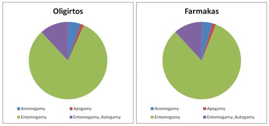 Regarding pollination, entomogamy is by far the most important pollination mode among the Greek endemic taxa of both Mt. Oligirtos and Mt. Farmakas since 93.4% and 94.1%, respectively, are pollinated by insects (Figure 3). However, 11.8% of the endemic taxa of both mountains are also autogamous. Anemogamous (5.3% and 4.4%, respectively) and apogamous (1.3% and 1.5%, respectively) plants have only a minor contribution to the endemic flora.