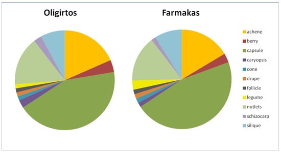 Almost half of the Greek endemic taxa found on Mts. Oligirtos and Farmakas bear capsules, while plants with achenes account for ca. one-sixth of all the endemics (Figure 4). Apart from silique (8% and 9% in the endemic flora of the two mountains, respectively) plants with other fruit types have a minor contribution to the endemic flora.