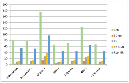 Number of Greek endemic taxa (Total), narrow endemics (50 km), Peloponnisos endemics (Pe), Peloponnisos and Sterea Ellas endemics (Pe and StE), and endemics with a wider distribution in Greece (Rest GR) recorded so far on Mts. Erimanthos, Panachaiko, Chelmos, Saitas, Oligirtos, Killini, and Farmakas. (Kruskal–Wallis one-way ANOVA: H = 5.577, df = 6, p = 0.472).