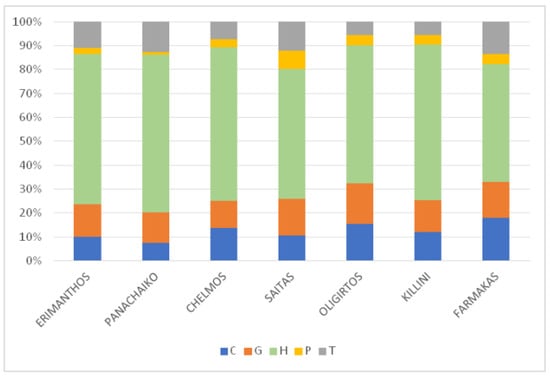 Life form spectra of the Greek endemic flora of Mts. Erimanthos, Panachaiko, Chelmos, Saitas, Oligirtos, Killini, and Farmakas. C: chamaephytes, G: geophytes, H: hemicryptophytes, P: phanerophytes, T: therophytes. (Kruskal–Wallis one-way ANOVA: H = 3.176, df = 6, p = 0.787).