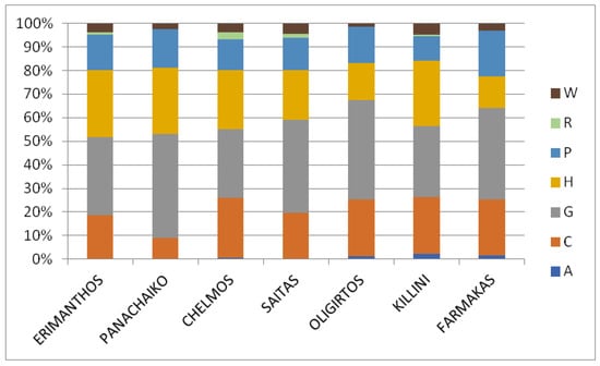 Proportion of the Greek endemic taxa hosted in each habitat category for Mts. Erimanthos, Panachaiko, Chelmos, Saitas, Oligirtos, Killini, and Farmakas. W: Woodlands and scrub, R: Agricultural and ruderal habitats, P: Xeric Mediterranean phrygana and grasslands, H: High mountain vegetation, G: Temperate and submediterranean grasslands, C: Cliffs, rocks, walls, ravines, and boulders, A: Freshwater habitats. (Kruskal–Wallis one-way ANOVA: H = 4.44, df = 6, p = 0.617).