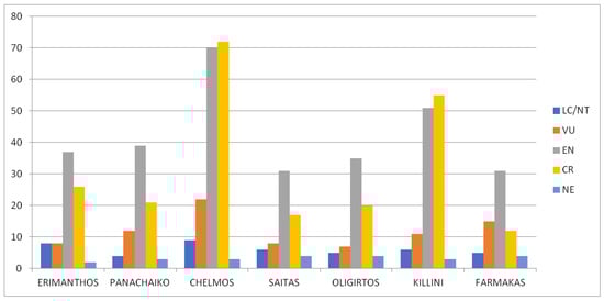Classification of the Greek endemic taxa of Mts. Erimanthos, Panachaiko, Chelmos, Saitas, Oligirtos, Killini, and Farmakas in the IUCN categories of threatened species. LC/NT: Least Concerned/Near Threatened, VU: Vulnerable, EN: Endangered, CR: Critically Endangered, NE: Not Evaluated. (Kruskal–Wallis one-way ANOVA: H = 1.625, df = 6, p = 0.951).