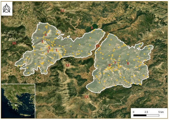 Map of the study area shown in white. Mt. Oligirtos (left) covers a total area of 104.71 km2; Mt. Farmakas (right) an area of 114.76 km2. Localities, where plant collections were undertaken, are shown by orange dots (neighboring localities in the same habitat have been merged for visualization reasons). The location of the study area in relation to continental Greece is also indicated (insert). 1: Skipiza summit (1935 m), 2: Gribini summit (1831 m), 3: Chionotripa summit (1800 m), 4: Mt. Parnias (1694 m), 5: Goupata plateau (ca. 1500 m), 6: Avizes summit (1615 m), 7: Kastro summit (1510 m), 8: Xerovouni summit (1432 m), 9: Lake Stymphalia, 10: Mt. Saitas, 11: Mt. Killini, 12: Mt. Skiathis, 13: Mt. Lirkio, 14. Xerolakka valley (540 m).