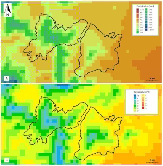 Excerpt of the Climatic Atlas of Greece 1971–2000, according to the Hellenic National Meteorological Service [33]: (A) Mean annual precipitation [mm], (B) Mean annual temperature [°C]. the Black line indicates the location of Mts. Oligirtos (left) and Farmakas (right).