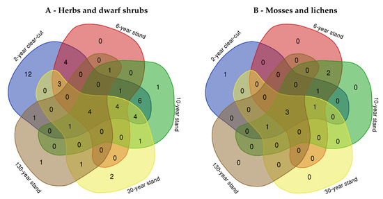 Venn diagram showing the diversity and overlap of the herbs and dwarf shrubs (A), mosses, and lichen (B) at the selected Pinus sylvestris sites, taken to represent clear-cuts (2-year-old clear-cut), young stands (6-year and 10-year stand), middle-aged stands (30-year stand) and mature stands (130-year stand).