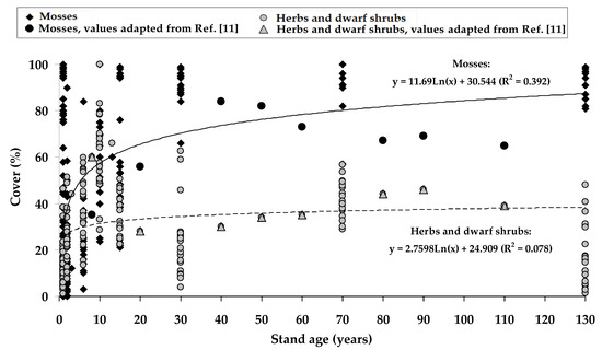 The regression models of the percentage cover of mosses, in addition to herbs and dwarf shrubs, according to the P. sylvestris stand age, were developed (Figure 2). Regardless of the successional status of individual species, the increase in the moss cover stabilized approximately 30 years after clear-cutting. Despite the relatively high variability of the data, the faster growth of herbs and dwarf shrubs was fixed at the early stage of the stand; this trend changed insignificantly in the 30–50-year-old stand and showed a slight decrease trend in the mature forest.