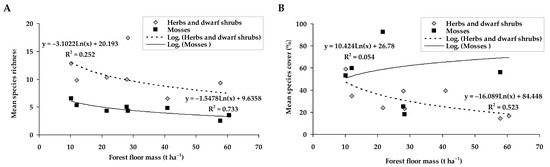 Relations between species richness (A) and cover (B) of herbs and dwarf shrubs and mosses with the forest floor mass; p ≤ 0.05.