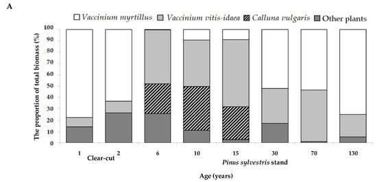 The herbs and dwarf shrubs in different sites consisted of similar species groups with the highest biomass proportion of the dominant species Vaccinium myrtillus and Vaccinium vitis-idaea with slight exceptions at the 6-year stand (Figure 4A). In the period from 6- to 15-year stand, a larger proportion of Calluna vulgaris biomass was observed. Mosses consisted mainly of the same species groups with the highest biomass proportion of the Pleurozium schreberi, Hylocium splendens, and Dicranum sp. (Figure 4B).