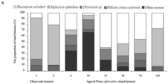 The proportion (%) of dominant herbs and dwarf shrubs (A) and moss (B) species of the total biomass of dominated ground vegetation species at different Pinus sylvestris sites, including 1–2-year-old clear-cuts and 6–130 years old stands.